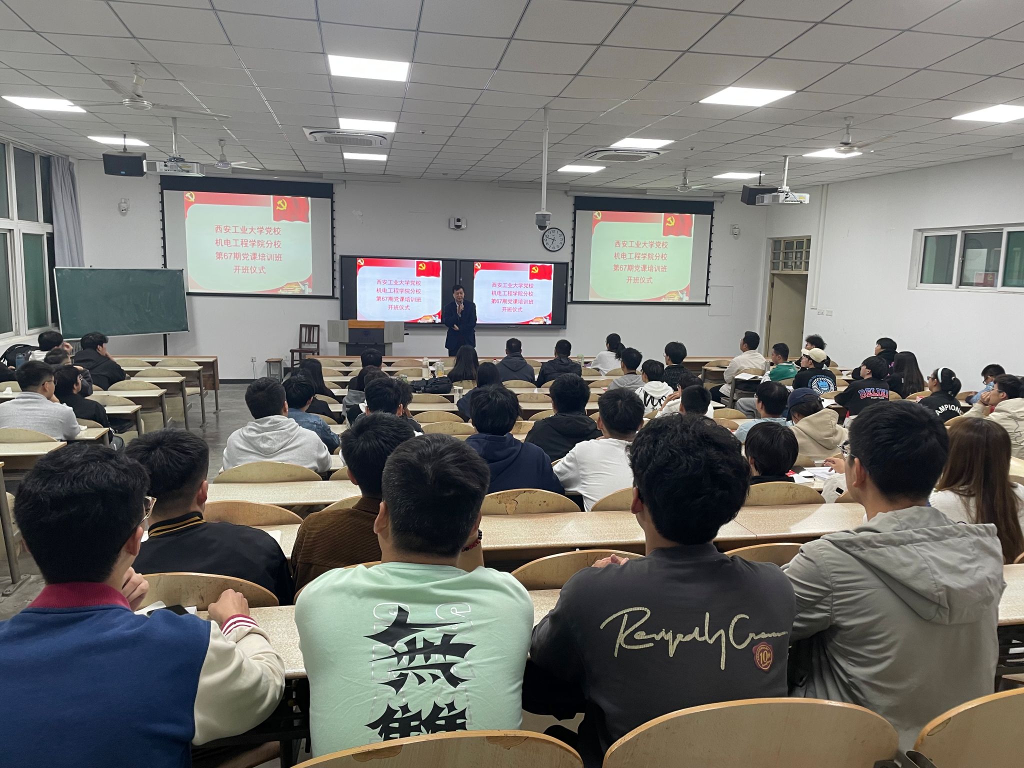 为了深入学习贯彻党的精神,加强入党积极分子的培训工作,提高学员的政治素质和理论水平,端正入党动机,坚定党的信念,2023年10月13日,公司组织的第67期党课培训班在教2-101开课。本次党课主题为“知史爱国,知史爱校”,由公司书记路金龙老师主讲,公司组织员张岩、22级主持人董俊卓及第67期积极分子参会。