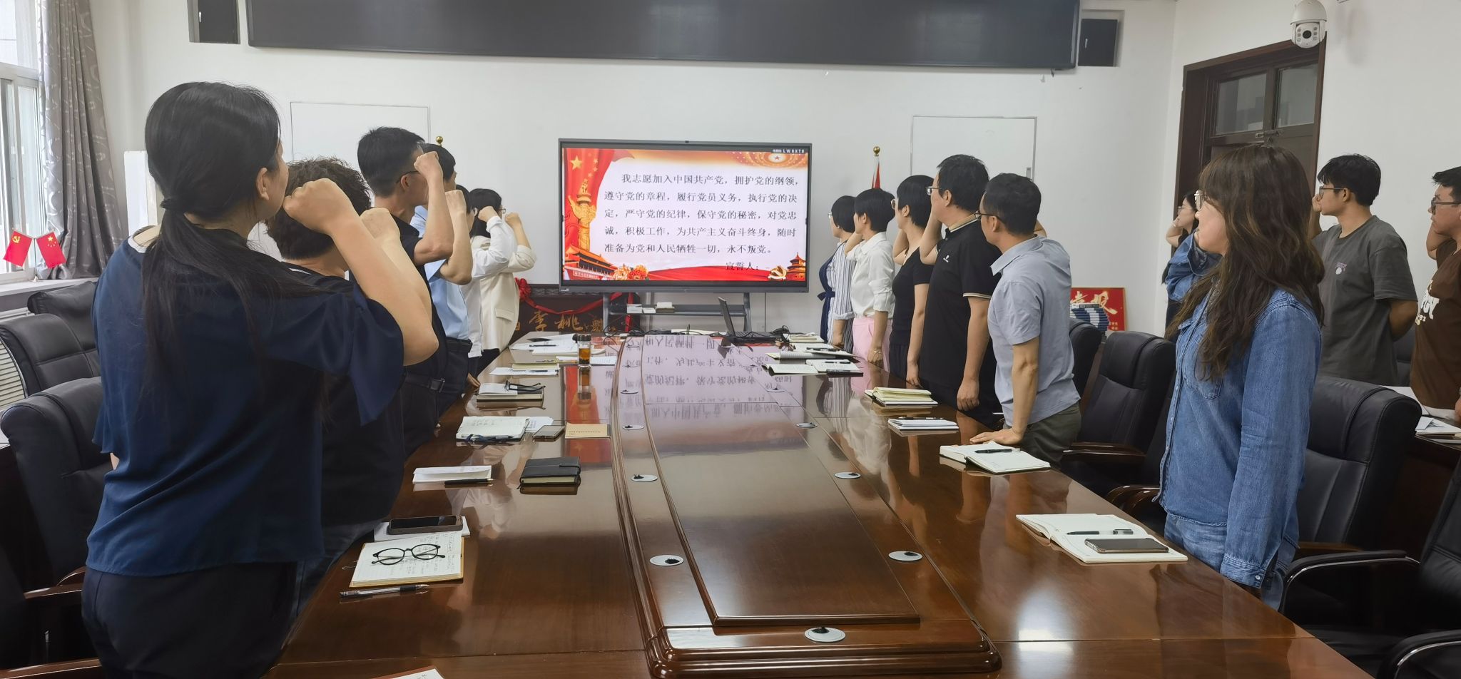 开班仪式在庄重的国歌声中拉开帷幕。随后由组织员张岩带领大家重温入党誓词。