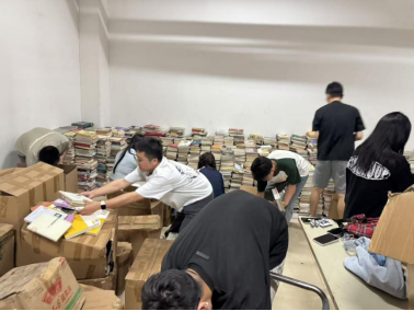 活动开始,两支党支部成员在现场负责人简要分工安排下迅速投入工作,整体队伍分为两组:一组负责将图书馆一楼存放的图书搬运至五楼,另一组则在五楼对图书进行整理、分类与上架,确保图书摆放有序,方便后续读者查阅和借阅。尽管图书数量众多、搬运任务繁重,但全体志愿者不怕脏、不怕累,始终以饱满的热情投入劳动中,现场呈现出一派忙碌而有序的景象。