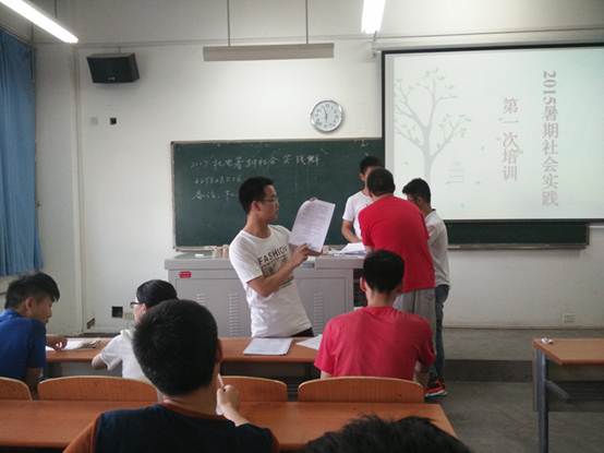 2015年6月11日下午5:30,太阳成tyc122cc在教3-201教室举行2015年暑期社会实践第一次培训大会。参加本次培训的有团委副书记胡俊杰、机电“阳光”青协主席张雪和上一届青协主席潘兵、秘书长张晨以及各实践团队的队长。