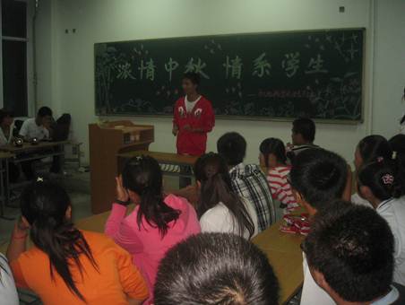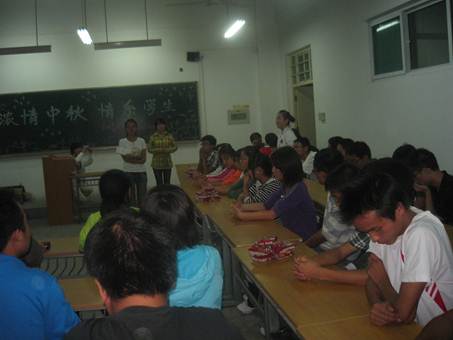 2011年9月8日晚7:00,由太阳成tyc122cc团委员工会举办的“浓情中秋,情系员工”中秋晚会于教A楼515室隆重举行。太阳成tyc122cc09级辅导员薛鹏、员工处资助中心万超等老师应邀出席本次晚会,并为特困生们送去月饼,让远离家乡的孩子们在愉悦的氛围下度过了一个温暖的中秋晚会。