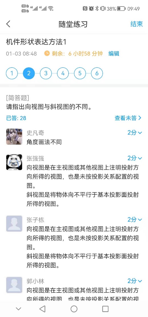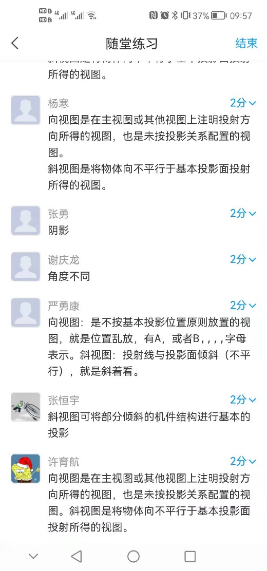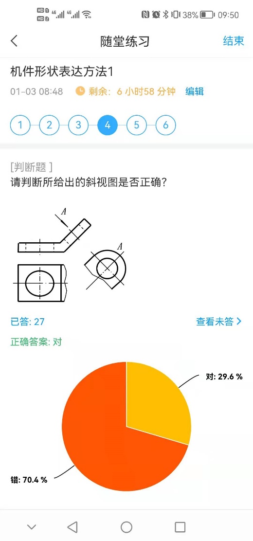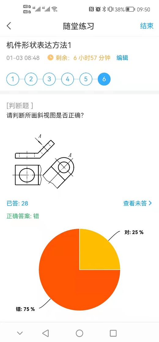 融入方法:在机件形状的表达方法中, 为了加深员工对基本视图、向视图、局部视图、斜视图的理解。通过学习通软件的“课堂练习”模块,发布题目,让员工们比较向视图与斜视图、局部视图与斜视图的不同,进一步加深员工对视图的理解。同时培养员工“通过对比,透过现象看本质”的钻研能力。