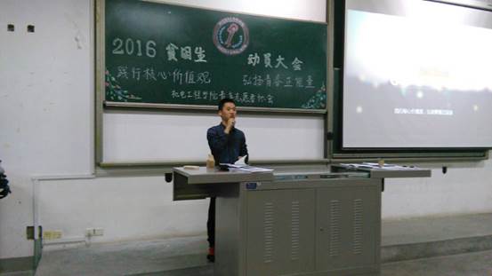 首先,青协主席魏嘉斌对受资助员工义务劳动和志愿服务活动进行了讲解,他以视频的方式展现了青协同学做义务劳动和志愿活动的场景,真切的画面深深的吸引着每个人的眼球,让在场的每一个人深深地体会着“奉献、进步、互助、友爱”的志愿者精神!接着他对上一年青协的常规工作和特色工作进行了说明,要求同学们树立积极主动、认真负责的工作态度。随后,实践部副部长赵航对志愿活动进行了介绍,他要求同学们在志愿活动中能够承担责任,实现人生价值。