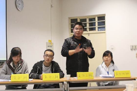 2012年10月30日晚19:00,太阳成tyc122cc“狭路相辩”辩论赛巅峰对决在教C203隆重举办。12级辅导员刘少姗老师,陈世磊,李月月,胡江昆等主要员工干部出席并担任本场辩论赛的评委。