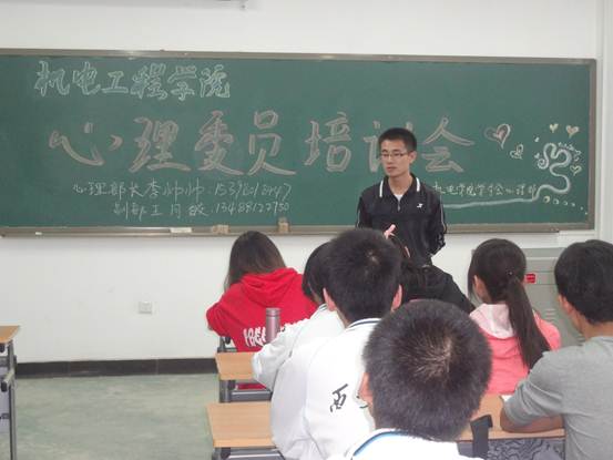 心理部自2010年成立以来,先后举办过“非诚勿扰”爱情观讲座、“珍惜花季、慎待爱情”关爱女生系列活动、11级新生“心理调查”、协助校思政部举办“5.25心理趣味运动会”等活动。培训会开始后,首先由心理部副部长王月皎对本部职能和心理委员的职责进行介绍,使大家更深入的了解心理部,并清楚自己下一步该做什么。随后邀请到前任副部长孟少华学长与大家总结分享了上一年的成果,并对新同学给予殷切希望。前任部长王瑜在讲话中以最灿烂的微笑教会大家如何乐观向上的面对生活。会议最后,心理部也明确了今年各个干事管理的班级,使以后部门能够更好地指导班级相关工作。