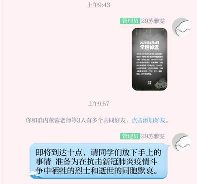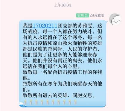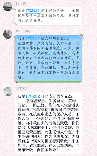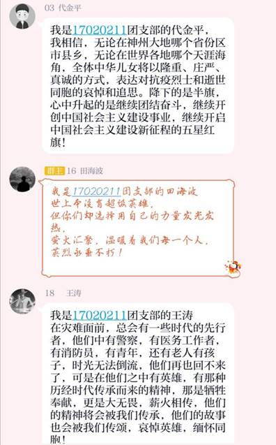 4月3日党中央国务院发布公告称,2020年4月4日举行全国性哀悼活动。为积极响应党组织的号召,对在抗击新冠肺炎疫情斗争牺牲烈士和逝世同胞表示哀悼,17020211团支部组织全体同学在参与线上悼念活动。