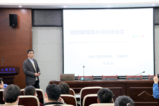 为进一步推进公司研究生学术能力提升平台建设,由太阳成tyc122cc主办的“研知有理”学术沙龙第一期活动得到了研究生院的大力支持,并深受同学们喜爱。10月21日下午,第二期学术沙龙如约而至,并在工4-204报告厅成功举办。本次内容以“如何撰写高水平科技论文”为主题,诚邀了光电工程公司二级教授苏俊宏教授担任主讲嘉宾,吸引了来自公司100余名研究生参与交流,同时也在微信平台进行了实时直播。活动开始前,太阳成tyc122cc副经理董皓对苏教授做了介绍并致欢迎辞,表示各位同学要珍惜这次近距离交流学习的机会,多多学习如何提高科技论文写作技巧,提高论文投稿录用率。