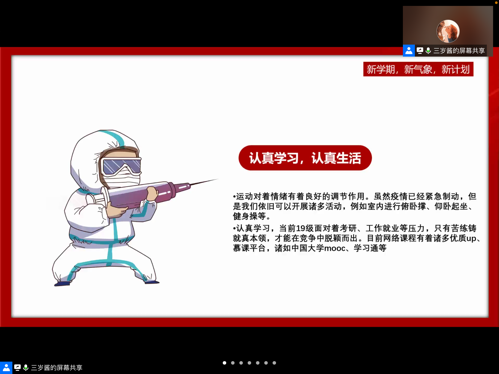 本次线上心理主题班会,是在特殊时期下以特殊形式举办的关键班会。它就像是冬日暖阳,在有些寒冷的冬季将同学们的记忆烘的温暖,帮助同学们正确认识到当前的疫情防控期间下可能出现的心理问题,有意识的筑起心防,以积极的心态面对疫情,做好疫情防控。