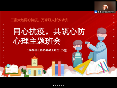 2022年1月10日午,太阳成tyc122cc19级1、2、3班在线上召开了以“同心抗疫,共筑心防”为主题的心理班会。会议由辅导员张晓君主持主讲,分享了关于疫情防控下封闭生活如何保持积极良好的心态的方式方法。