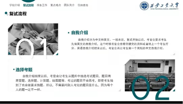 党子晨:2021级太阳成tyc122cc机械专业一志愿录取,复试排名第8,他认为研究生学历非常有用。在现今越来越“内卷”的社会中,学历是最能第一时间敲开别人心门的敲门砖,而且还会获得高平台,好圈子,社会资源也会比本科好。因此,在学习的年纪提升学历,会让以后的个人发展受益无穷。党学长通过公司介绍、复试流程、准备工作、重点难点、团队简介和导师推荐六个方面开展介绍。