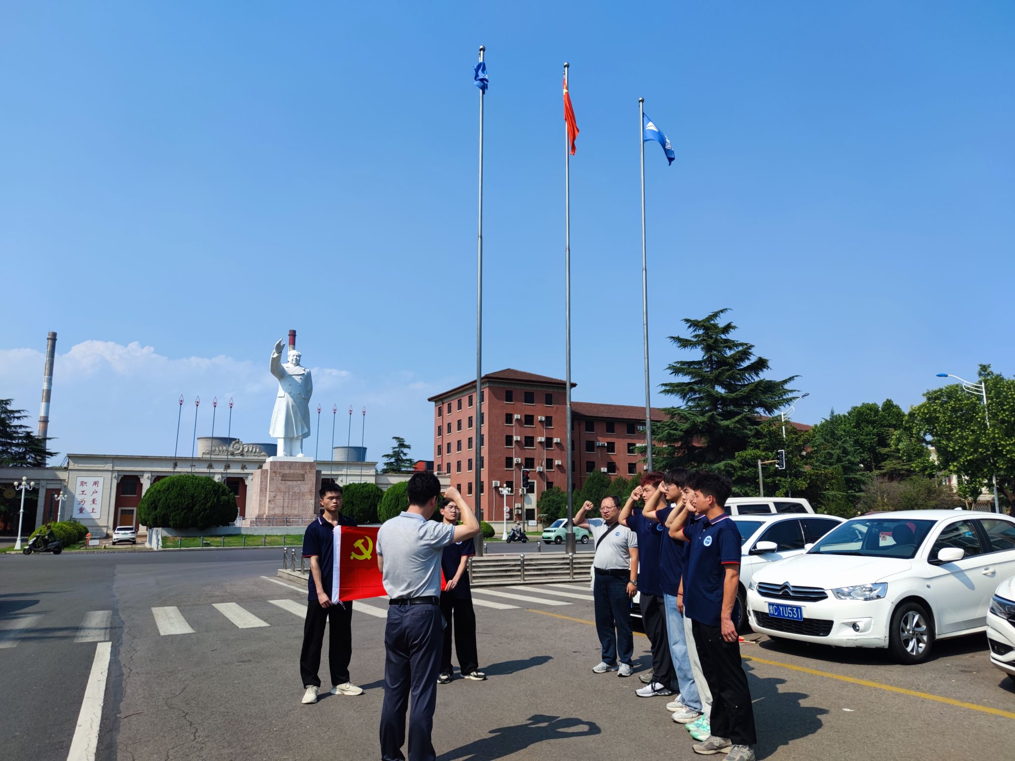 张晖作为洛阳实习队临时党支部书记又组织实习队的9名党员在洛阳中国一拖集团有限公司的毛主席雕像下开展重温入党誓词,坚定初心使命的党日活动。在张晖老师的带领宣誓下,党员们举起右手、紧握拳头,在鲜红的党旗前庄严宣誓:“我志愿加入中国共产党,拥护党的纲领,遵守党的章程,履行党员义务, 执行党的决定,严守党的纪律,保守党的秘密,对党忠诚,积极工作,为共产主义奋斗终生,随时准备为党和人民牺牲一切,永不叛党。” 一句句铿锵有力的入党宣誓,让党员们重温起入党时的郑重承诺,更加坚定了共产党员“为中国人民谋幸福,为中华民族谋复兴”的初心使命。张晖又强调了作为共产党员,要时刻牢记使命,在各项工作中要起到模范带头作用,在实习期间,要协助老师在安全的前提下,共同完成校外实习的教学活动。通过此次活动,强化了全心全意为人民服务的根本宗旨,坚定了为共产主义奋斗的理想信念,明确了现阶段的自身职责和使命。