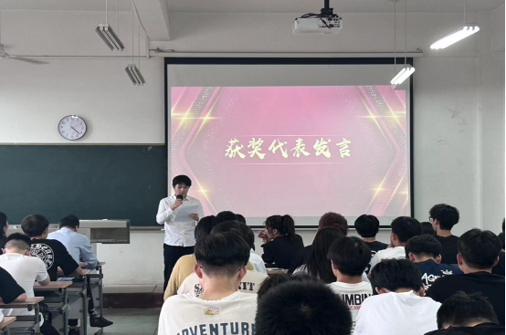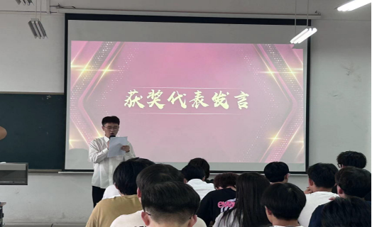 颁奖仪式结束后,作为三好班级,五四红旗团支部标兵获得班级班长冯正阳同学上台发言。他结合班级与个人发展实际,与同学们分享自己在班级管理以及自身发展的经验,呼吁同学们在以后的学习生活中,要立足新起点,抢抓新机遇,奋力谱写个人与班级发展的新篇章。